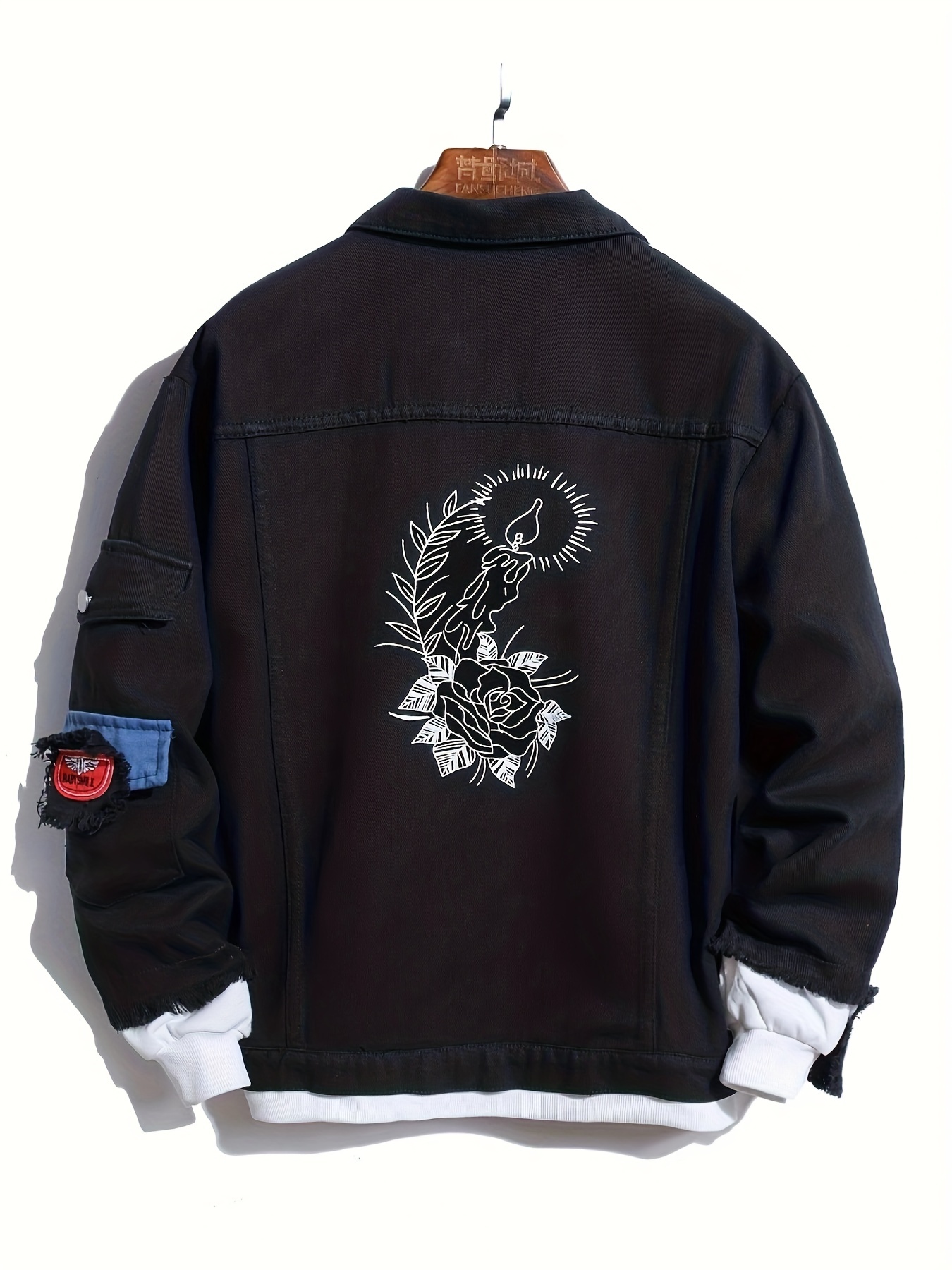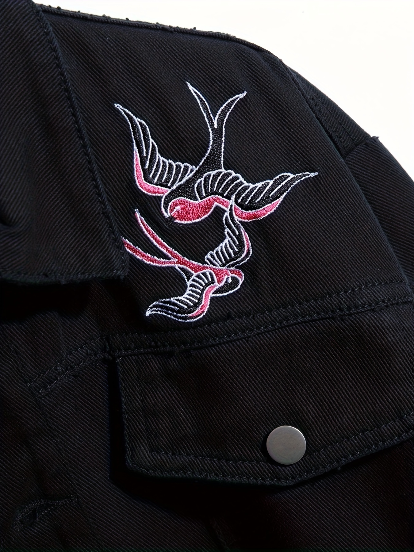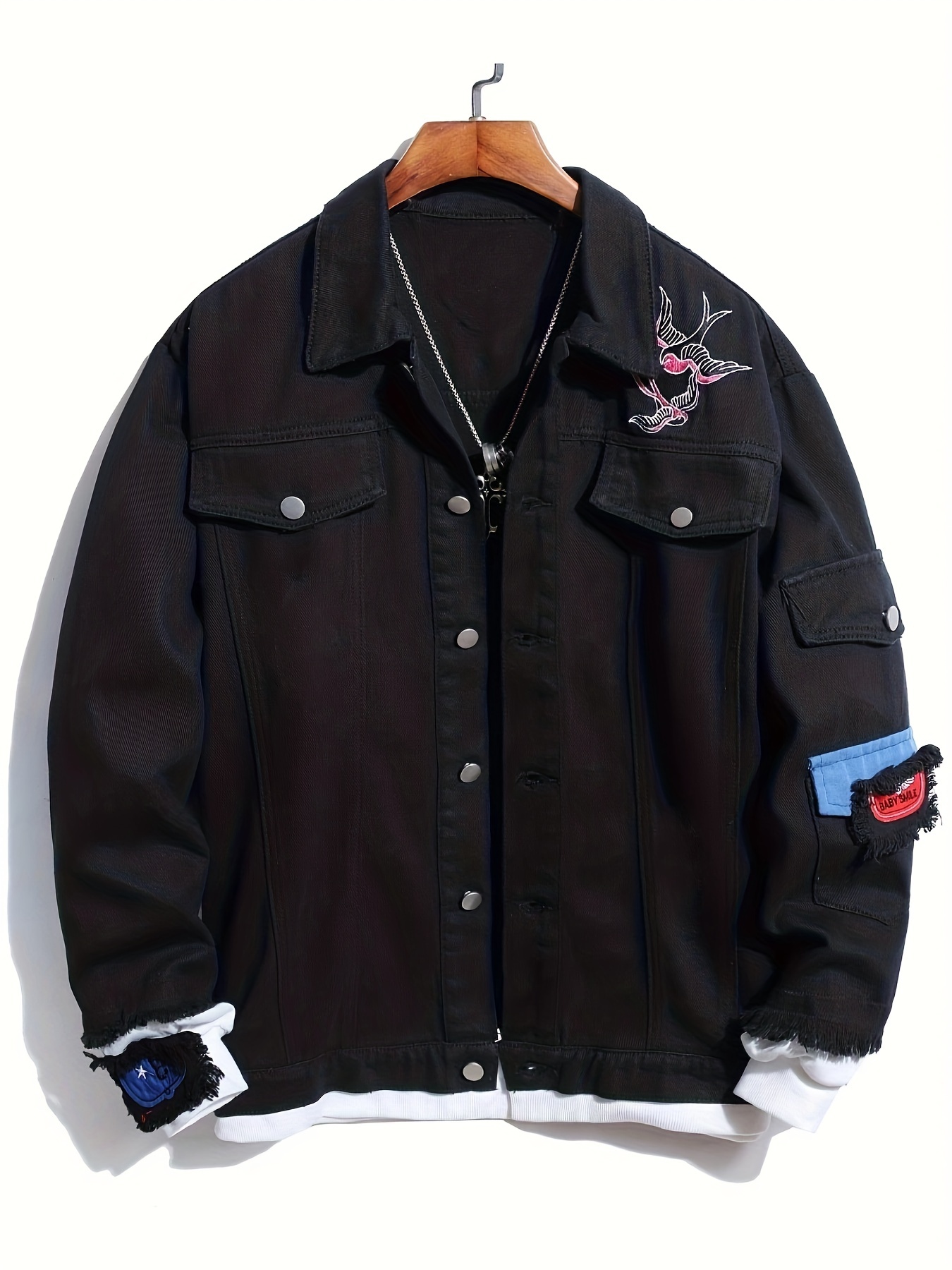 Bird Embroidery Denim Jacket, Men's Casual Flap Pocket Button Up Jacket For Fall Winter